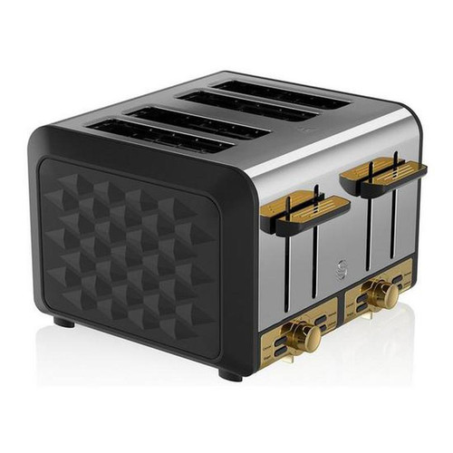 From the Swan Gatsby Range, this eye-catching toaster brings the perfect blend of class and style to any kitchen. With the capacity to make four slices of toast at once, this toaster is perfect for the morning breakfast rush. Independent variable browning controls allow you to toast your bread to perfection, every time, so if your partner likes their toast golden brown and you like yours a little darker, just adjust the dial on your side. This chic toaster comes with a range of impressive functions including a cancel, defrost, reheat and a bagel function. The wide slots accommodate bread of any size as well as crumpets, muffins, and bagels. The self-centering guide ensures your bread is always evenly toasted and an anti-jam and bread lift function make removing your toast effortless and safe. The Gatsby toaster also comes with a removable crumb tray to allow for hassle free maintenance. With a chic matte black casing, chrome and gold detailing this trendy toaster looks great on any kit